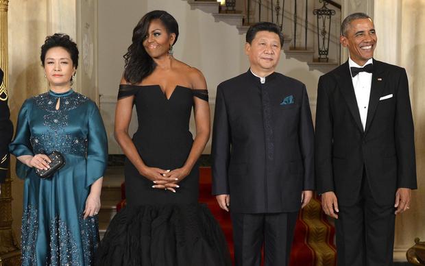 Here, first lady Michelle Obama embraces spring with the strapless floral gown she wore to the White House dinner for Canadian Prime Minister Justin Trudeau on Thursday, March 10, 2016.